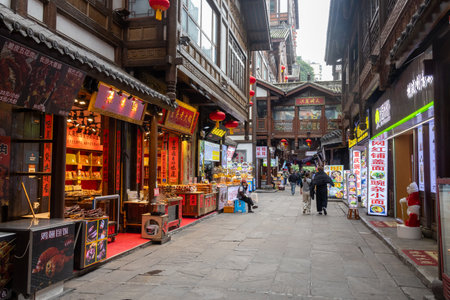 Chongqing, China- 11 Nov 2025: View of Ciqikou or Porcelain Port in Chongqing, China. It features ancient streets with Ming-Qing architecture, Baolun Temple, and a historic port