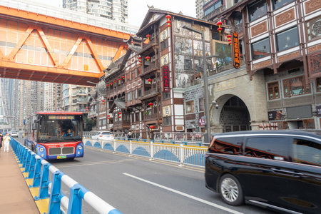 Chongqing, China- 2 Nov 2025: Beautiful view of Chongqing city with Hongyadong and Qiansimen bridge.