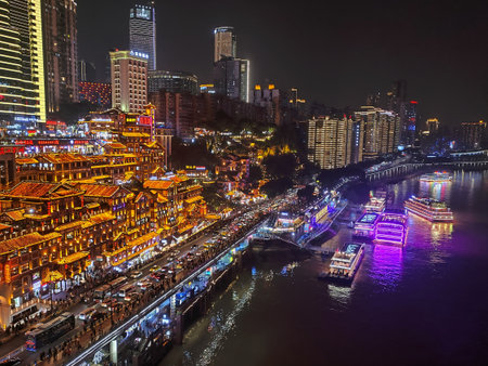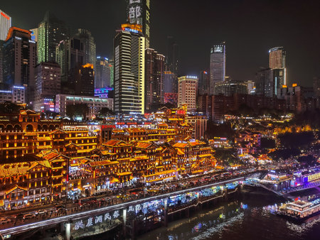 Chongqing, China- 8 Nov 2025: Night view of Chongqing city in China with Hongyadong Scenic Area. It offering breathtaking views of Chongqing's multi-layered urban landscape