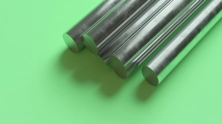 A visual composition featuring metallic cylinders arranged on a bright green surface showcases reflections and shadows, exemplifying modern design and minimalism.