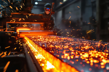 Metal Processing Sparks. A worker in protective gear oversees molten metal being processed, surrounded by flying sparks and glowing materials.