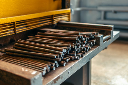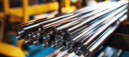 Close-up view showing the dark steel rods that are stacked neatly for various industrial uses. Generative AI