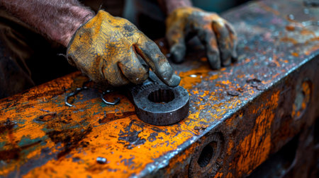 A man in dirty work gloves holding a wrench on an old rusty metal table, AI