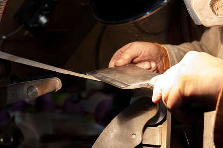 Blade sharpening creating on a belt grinder process. Knife making master hands close up.