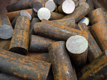 a pile of raw steel short rods cutted by saw- workpieces prepaired for forging, close-up with selective focus
