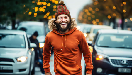 Portrait of a handsome young man with curly hair in a warm hat and sweatshirt on the street.