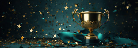 A golden trophy stands prominently against a dark backdrop, with confetti adding a celebratory touch, symbolizing achievement and success.