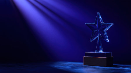 A single star trophy stands on a dark stage, bathed in a striking blue spotlight that creates dramatic shadows and highlights.