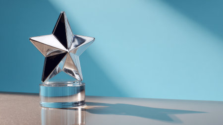 A close-up shot of a shiny silver star trophy with a clear glass base, set against a soft blue background. Light casts dramatic shadows.