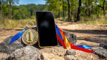 A gold medal sits next to a smartphone on rocks, adorned with colorful ribbons in a serene natural landscape. Ideal for themes of achievement and recognition.