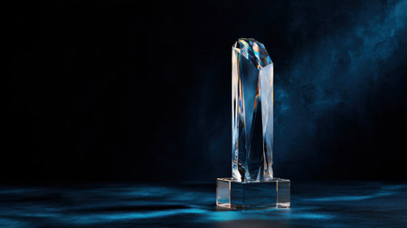 A single clear glass star trophy sits on a surface, illuminated by a spotlight that casts a long, dramatic shadow.