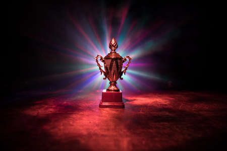 Golden trophy cup on table dark background with copy space. Creative artwork decoration with toned foggy backlight. Selective focus