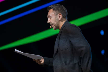 Moscow, Russia - April 23, 2018: Russian rock musician celebrity Sergey Shnurov performs at the business conference