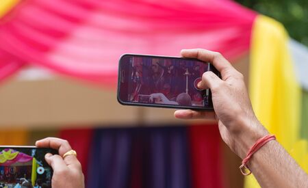 hands holding mobile phones and shoot video on them. bright colored background of Indian concert in blur. the sharpness on the hand with phone