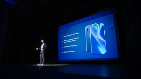 Live Event with Brand New Products Reveal: Speaker Presents Smartphone Device to Audience. Movie Theater Screen Shows Mock-up Touch Screen Mobile Phone with High-Tech Features and Top Highlights