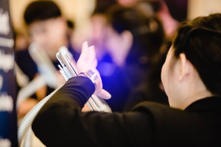 Using a smartphone in a public event. Holding a mobile phone in hands and shooting photo or video content.