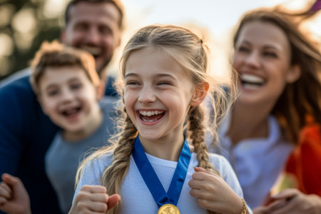 A young girl beams with pride as she holds a medal, surrounded by her joyful family. They celebrate her achievement outdoors, basking in the warm sunlight of a clear day.