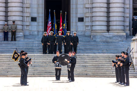 Mauthausen, Austria-May 10.2015: military celebration of the Mauthausen camp liberation by all the countries involved paying tribute to the fallen through military parades and floreal wreaths on monuments during a sunny day.