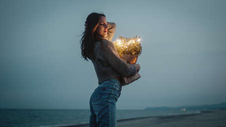 Happy young girl enjoys life on the beach with colorful lights on bag