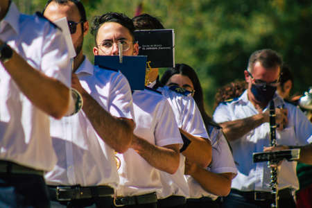 Carmona Spain September 26, 2021 Focus of members of a local music orchestra playing music in the streets of Carmona during the coronavirus epidemic hitting Spain