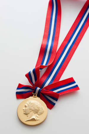 Medal gold, Winner prize award and red blue color ribbon. Athlete trophy in sport for first place champion isolated on red background, copy space, template.