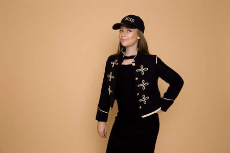 Beautiful little girl in elegant, spring black dress and jacket on a beige background in the studio. Kids fashion. Elegant young fashion. Elegance.