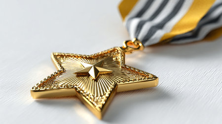 Close-up image of a gold medal with a red ribbon resting on a marble podium. The detailed engraving and texture are highlighted by soft studio lighting, set against a clean white background.