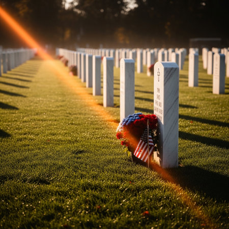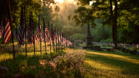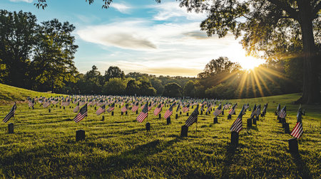 A peaceful cemetery scene at sunrise with American flags waving gently in the early morning light, surrounded by lush greenery and blooming flowers.