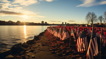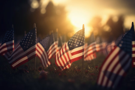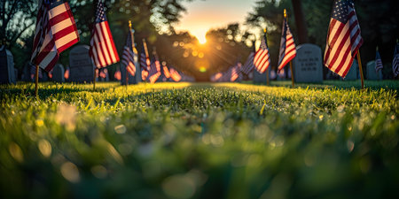 As the sun sets over the tranquil cemetery, American flags stand as silent sentinels, honoring the memory of those who gave their lives for their country in a poignant display of patriotism