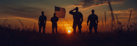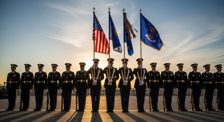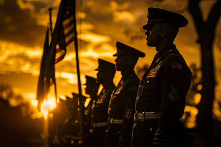 A group of soldiers stand in formation, holding flags and wearing uniforms. The scene is set at sunset, creating a serene and peaceful atmosphere. The soldiers are positioned in a line