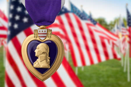 Purple Heart Miltary Merit Medal Against Memorial Field of American Flags