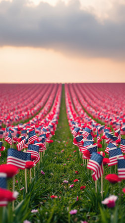 Vibrant rows of flowers adorned with small American flags at sunset in a rural field