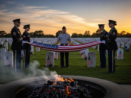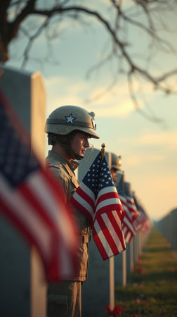Soldiers honor fallen heroes with flags during sunset at memorial site