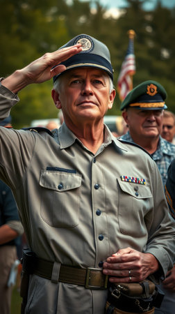 Respectful salute during a military ceremony with veterans and officials in attendance