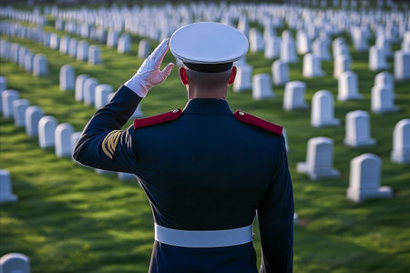 Military officer saluting in a cemetery, honoring fallen soldiers with a field of white gravestones in the background