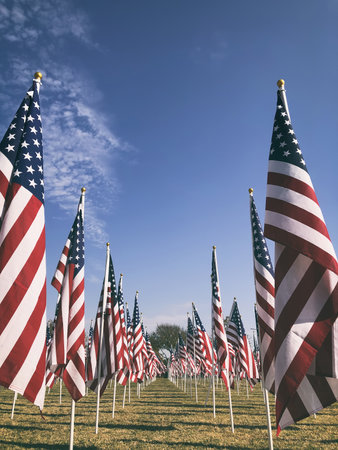 Numerous American flags waving in a golden field, a poignant tribute to patriotism and national pride.