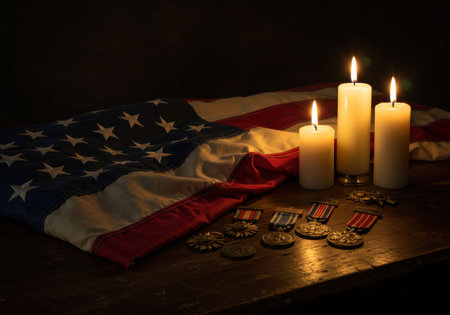 United states flag, military medals, and candles on dark wood for Memorial Day or Fourth of July remembrance.