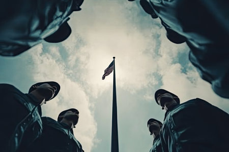 Group of soldiers stand in uniform looking at the American flag waving in the sky