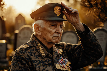 An elderly veteran in military uniform salutes in a cemetery at sunset