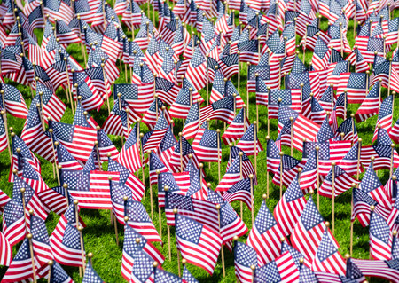 Row of American flags standing in the green field. Veterans Day display. Blue sky background.
