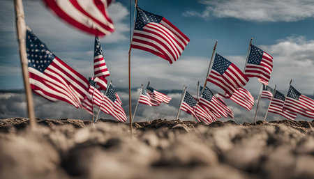 A collection of American flags wave in the wind on a sandy beach, creating a colorful and patriotic scene.