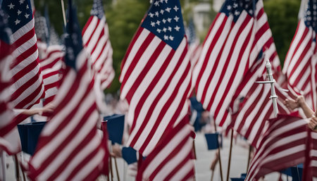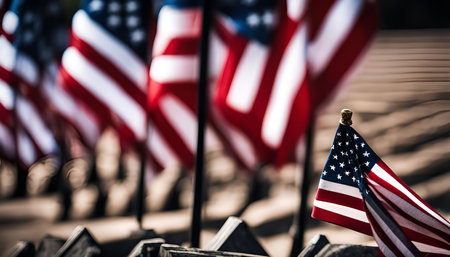 A row of American flags in a shallow depth of field, with a focus on the front flag. The flags are waving gently in the breeze, and the red, white, and blue colors are vibrant.