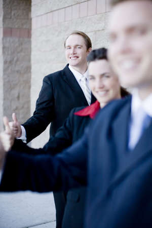 Three business people wearing suits standing in a row all giving thumbs-up
