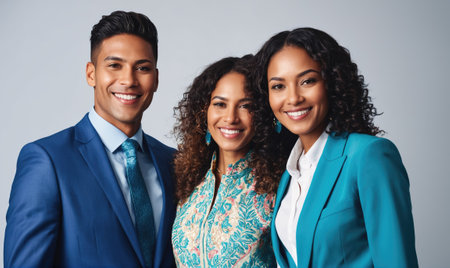 Group of happy indian business people with arms raised celebrating success, isolated over blue background Generative AI