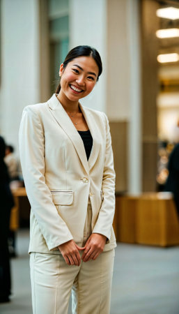 photo of beautiful asian woman with beige suit and white crop top, generative AI