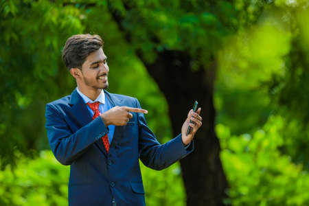 Happy businessman pointing finger on blank smartphone screen