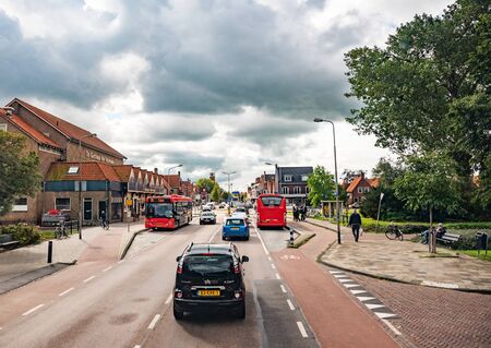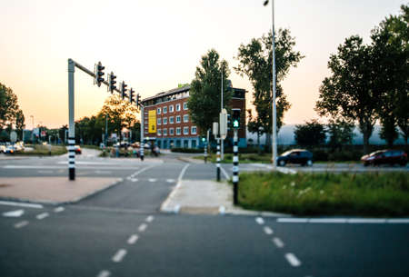 Haarlem, Netherlands - Aug 26, 2019: Tilt-shift lens used to focus the Ibis Styles Hotel in periferic Haarlem near Bloemendaal with defocused part of the highway and cars