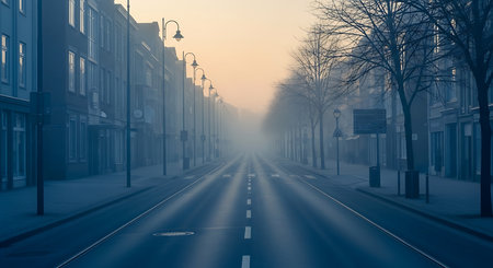 A serene, atmospheric view of a deserted city street bathed in soft morning sunlight filtering through mist.