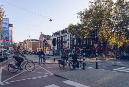 Amsterdam, The Netherlands, October 11, 2018: typical crosswalk with bicyclists, pedestrians and tarditional holland houses