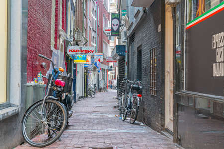 Amsterdam Holland - August 19 2017; Narrow urban streets or lanes between buildings with bicycles shop fronts and signs
